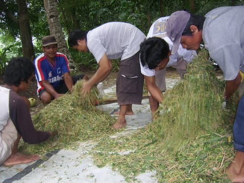 -Rumput dipotong kecil kecil +-2-3cm pake sabit atau pake mesin copper kalo skala besar dan di angin2kan,kemudian dicampur dengan dedak dan di sprey pake cairan urea dan tetes tebu yang telah diencerkan dengan air.setelah itu masukkan kedalam plastik atau silo dengan cara dipadatkan,jangan sampe ada udara yang terjebak karena akan sangat berpengaruh pada proses fermentasi,dan kemudian ditutup rapat rapat dengan plastik atau alat penutup.